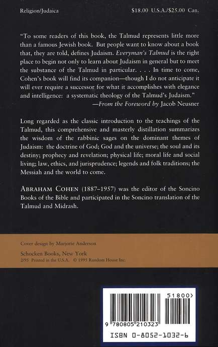 An elegant introduction to the definitive teachings of Judaism. Making the wisdom of the rabbinic sages accessible to scholars, students, and laypeople, Abraham Cohen offers a lucid distillation of dominant Talmudic themes, including God and the universe; the soul and its destiny; prophecy and revelation; physical, moral and social life, law, ethics, the Messiah, the world to come and legends and folk traditions.