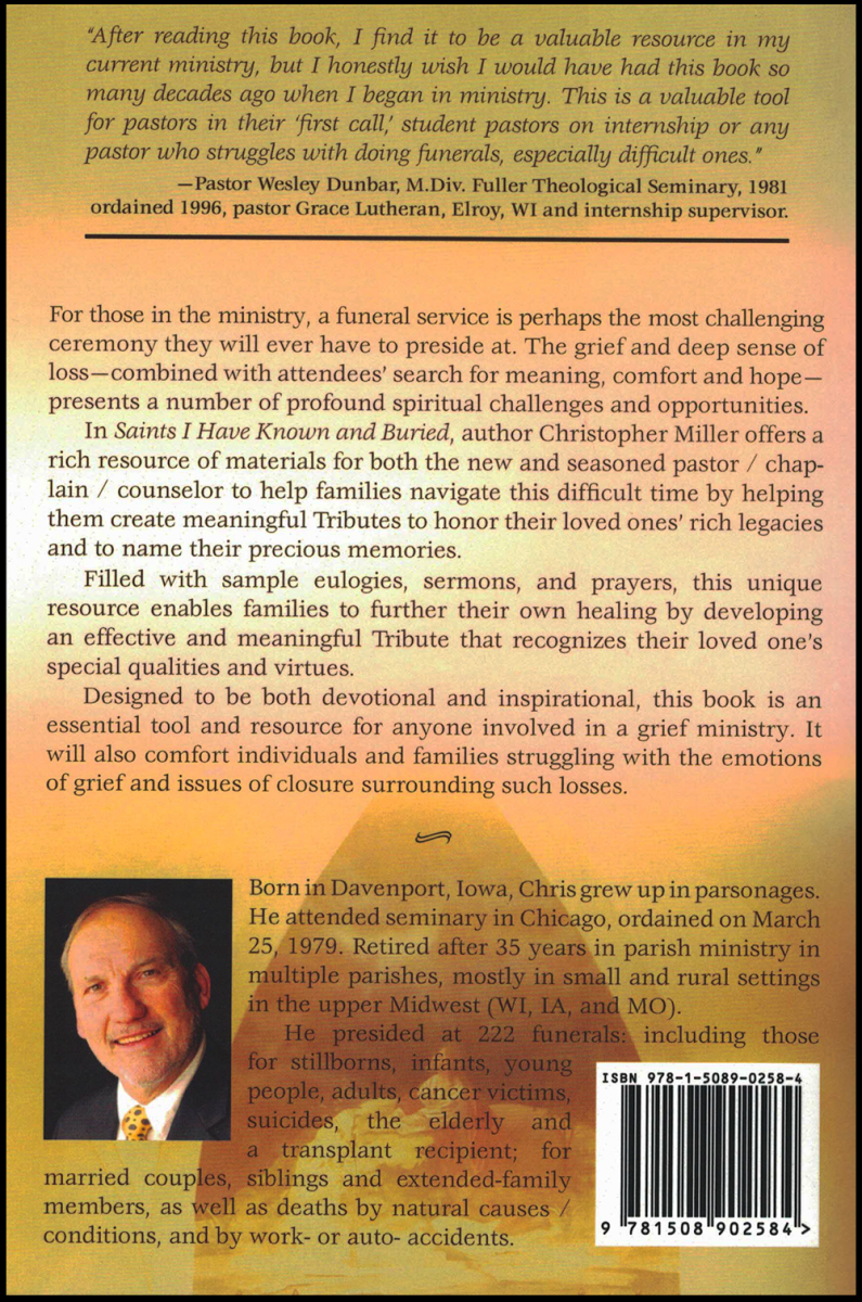 In Saints I Have Known and Buried, author Christopher Miller offers a rich resource of materials for both the new and seasoned pastor/chaplain/counselor to help families navigate this difficult time by helping them create meaningful tributes to honor their loved ones' rich legacies and to name their precious memories.