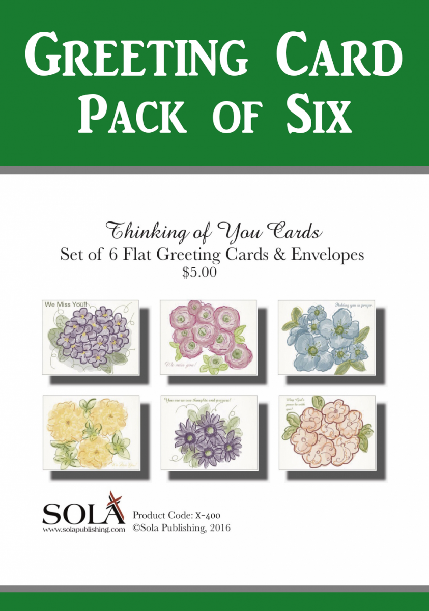 This pack of six greeting cards includes notes such as, "We miss you!," and "Thinking of you." They are great for keeping in touch with folks who haven't been in worship for awhile, shut ins, or anyone you want to reach out and remind of God's love.